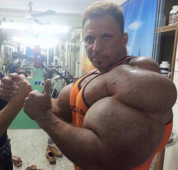 This guy has the biggest arms ever. What the heck is he putting in there? The skin looks so pumped it's going to rip. Good god man!