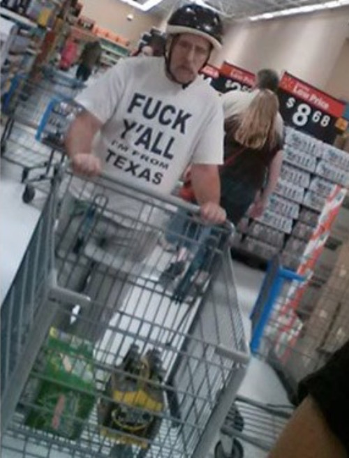 Get your bike helmet's at Walmart and they will throw in an angry shirt saying Fuck Y'all I'm from Texas. Act now they'll go fast.