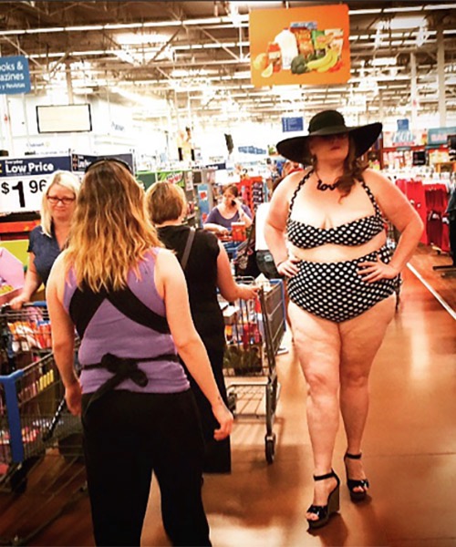 It's important to not only look your best but dress appropriately in the summertime at Walmart. This woman knows how to show off her long legs while blocking out the harmful rays of the sun with a sun hat.