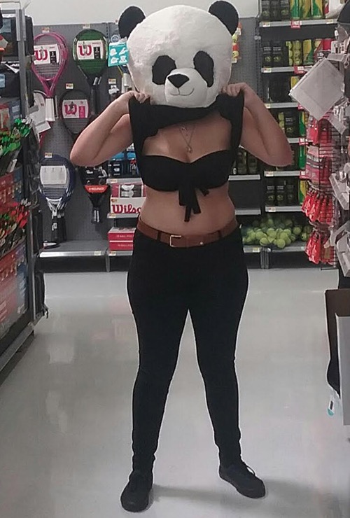 This panda is striking a pose at Walmart. Either she's trying to show off her new black bikini top or she's asking for directions back to the zoo.