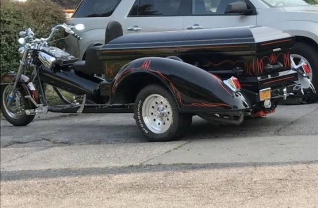 The black coffin trike is great for those long rides across the country. It sleeps one so you never have to go to a bed and breakfast.
