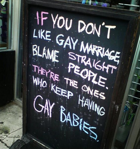 If you don't like gay marriage blame straight people. They're the ones who keep having gay babies. Nothing like a colorful sign to help clear up social injustice.