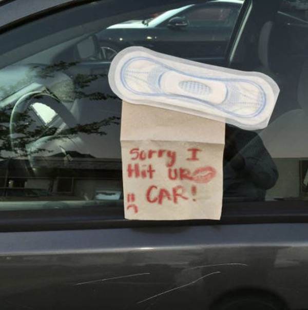 Sorry I hit your car but I left you this note written in blood and used a sanitary napkin as a sticky note. I guess they like to improvise at Walmart.