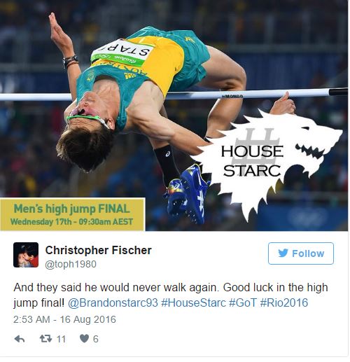 "And they said he would never walk again. Good luck in the high jump final! @Brandonstarc93 #HouseStarc #GoT #Rio2016 " - @toph1980