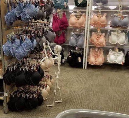 You know the bras are for thin girls when a skeleton shows up to buy them. Now that's thin!