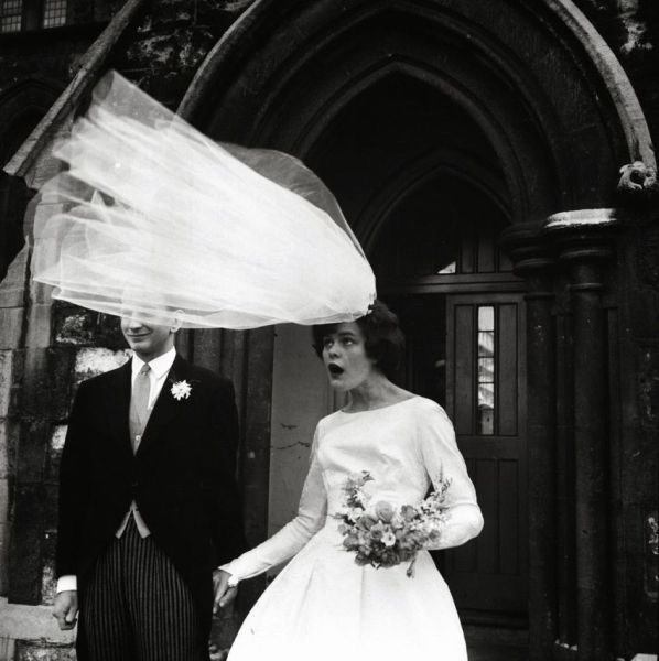 The wind gets any stronger and she'll be flying along with that veil. What a great shot for the wedding album though. Priceless! It looks like she's sneezing.