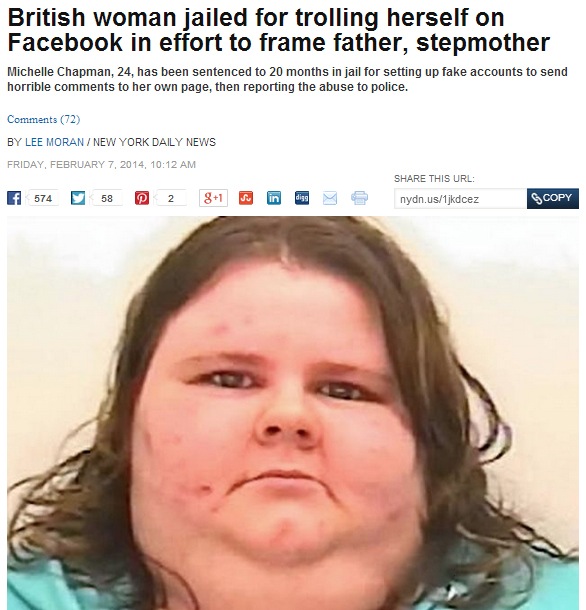 British woman jailed for trolling herself on Facebook in effort to frame father, stepmother. Michelle Chapman 24 was sentenced to 20 months for setting up fake accounts sending herself horrible comments then reporting abuse to police.