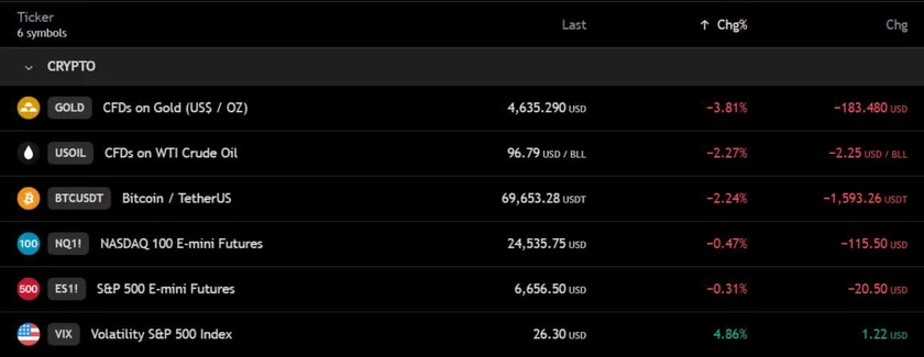 $BTC has dropped below the $70,000 level. US stock futures are down, and VIX is back above 26. Pre-market stock trading insights: ▫️Nasdaq futures is down 0.47% 🔴 ▫️S&P futures is down 0.31% 🔴