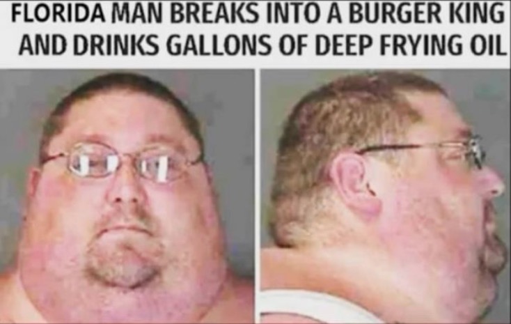 Florida man breaks into a Burger King and drinks gallons of deep frying oil.