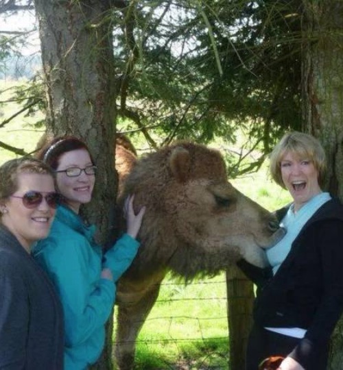 I guess these camels are not shy. I would have gone for her cheek. I just hope he lets go or she's going to be missing a boob.