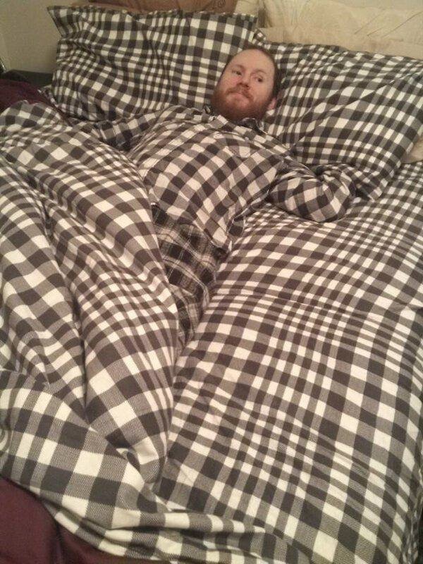 I can't tell where the sleeping guy begins and his bed ends. It's like he's part bed. It definitely looks comfortable but that pattern is making my eyes hurt.