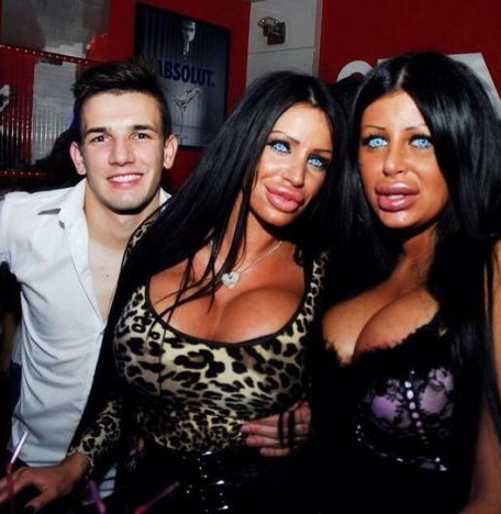 Plastic surgery shouldn't be used to go crazy on your face. These ladies have mangled theirs beyond recognition. The guy is cracking up just standing next to them