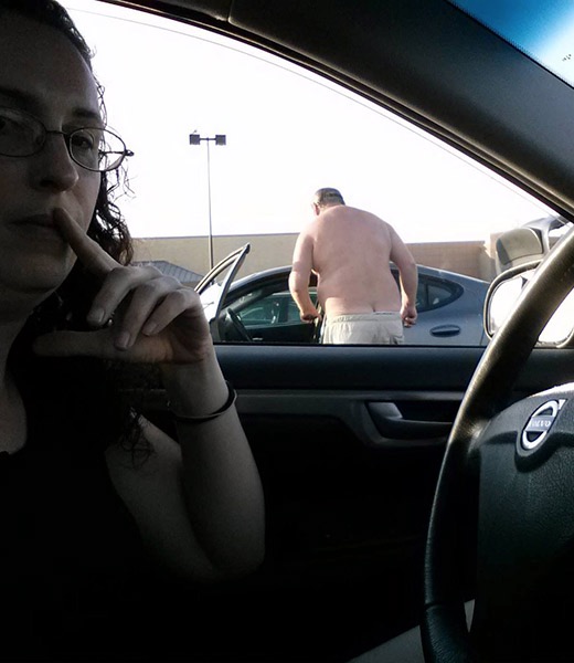It's not safe in the Walmart parking lot. Look at this poor girl get a car butt crack right in broad daylight. Somebody call the fashion police.