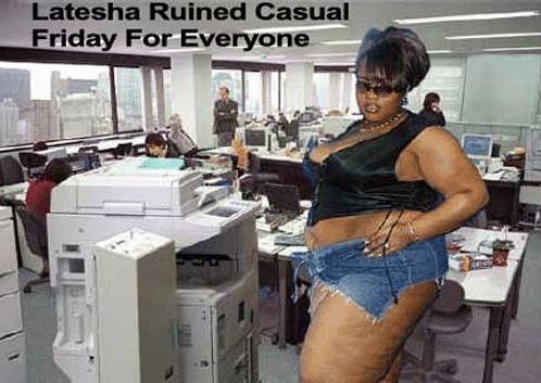 Latesha ruined casual friday for everyone. Just when we were getting to work comfy in our jeans and doing a TGIF she had to come in dressed like a ho.