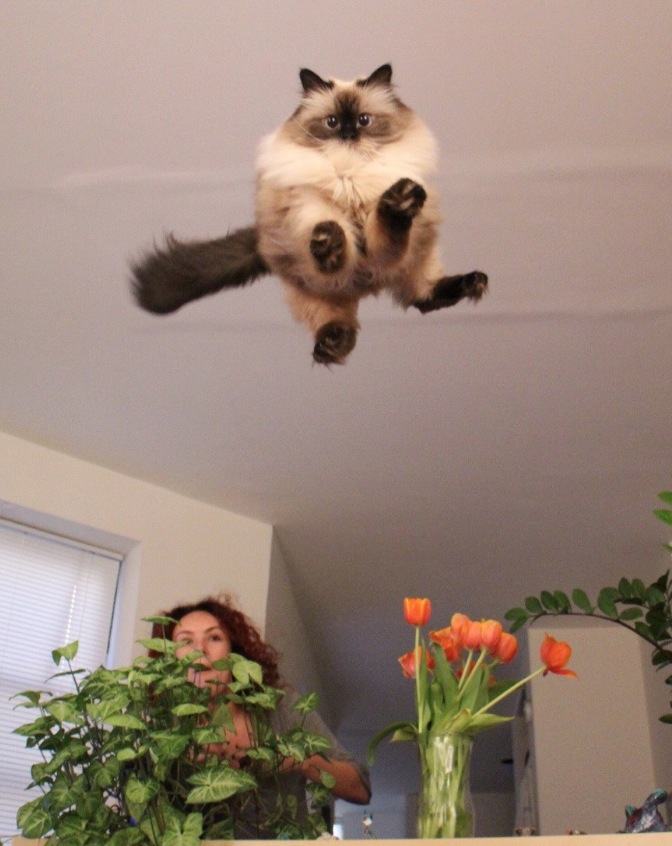 This beautiful kitty is catapulting across the room. Hopefully he's not going to land on somebody's head. We do know he will land on his feet! Look out below!