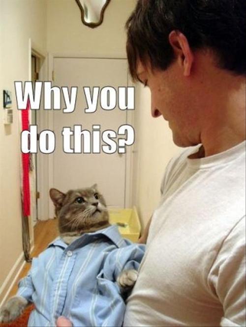 Nothing like dressing up your cat in your favorite shirt. But even better than that is the look on the cat's face afterwards. Daddy why did you do this? Hilarious!