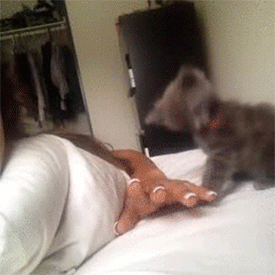 I really love cat GIFs because they are so cute. In this one the person is playing with the cat by moving her hand in front of the cat. The cat is thinking, rather the kitten is thinking "I must conquer The Hand else it will conquer me". Hahaahhhahh just imagine that. It is so cute.