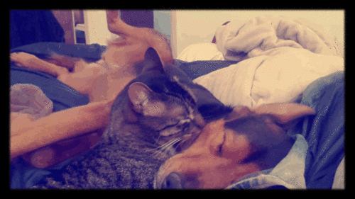 Look at these two so in love. Watch this cat clean his best buddy by licking him on the check. BFF! Completely precious. The dog is having sweet dreams