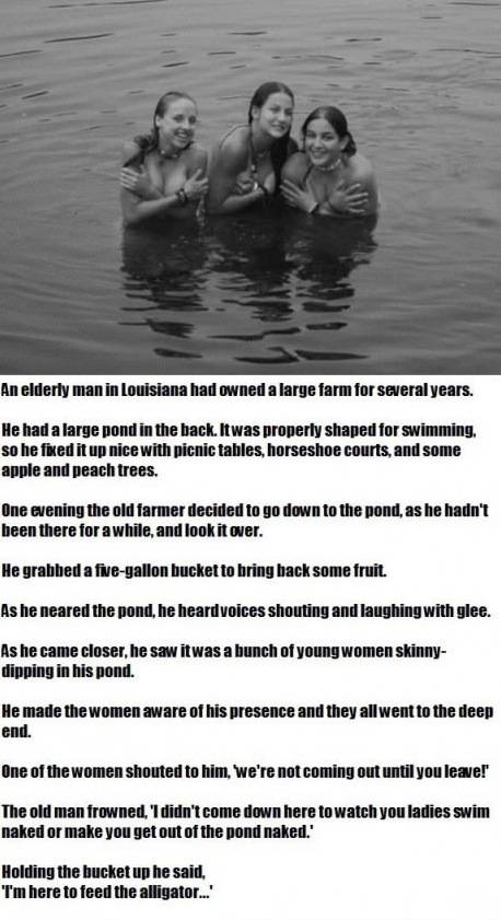 These ladies got a big surprise when they went skinny dipping in a man's lake. I didn't come here to see you naked, I came here to feed the alligator!
