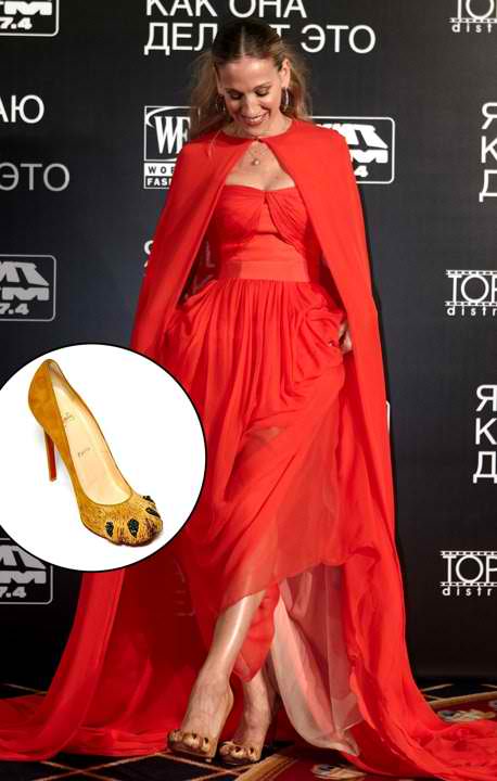 To complete her little red riding hood attire, she wore paw-shaped pumps that gave her entire look a certain edge at the film presentation of "I Don't Know How She Does It" in Moscow, Russia. Way to go SJP!