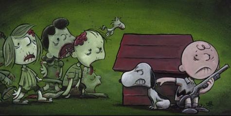 Charlie Brown is hiding behiend the dog house while the zombie come closer to him and the snoopy is protracting him
