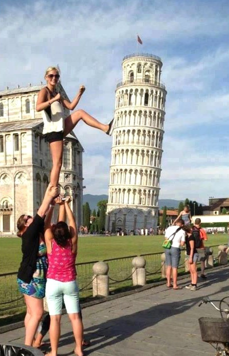 Leaning Tower of Pisa is one of the greatest building in the world everyone that seen it are posing like they are knocking it down but this cheerleaders I think they pulled it off nicely