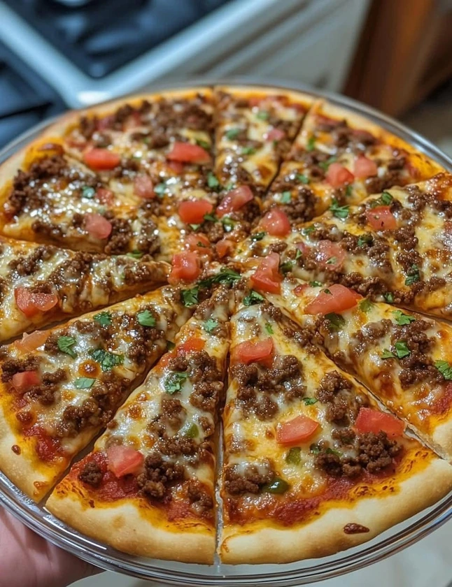 Two favorites in one? This Taco Pizza combines crispy crust, seasoned beef, gooey cheese, and fresh toppings for an explosion of flavor! 🌶️🤤