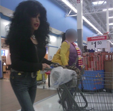 Cher spotted at Walmart. Signature giant black hairdo is unmistakeable. Then again, maybe it's an inflatable blow up doll. I really can't tell.