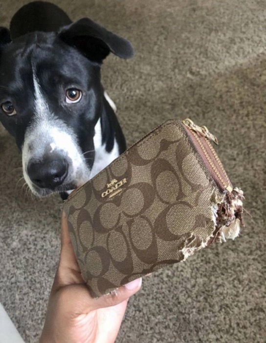 I have a sneaking suspicion who chewed up my purse. You can see he's ready to confess.