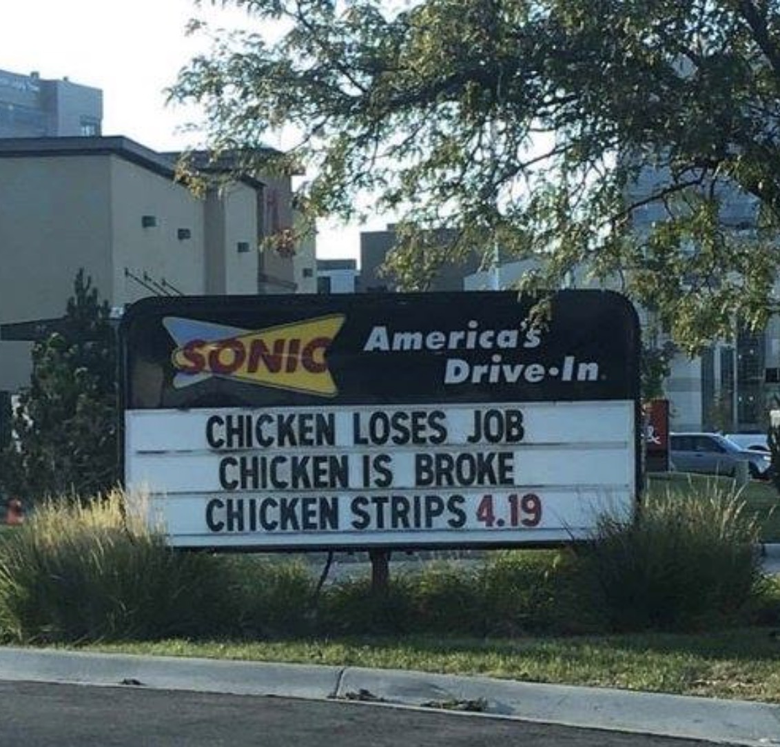 This chicken has fallen on hard times. Chicken loses job. Chicken goes broke. Chicken strips.