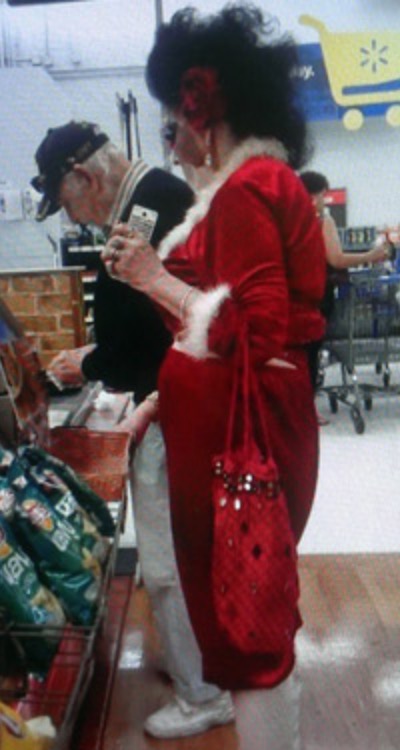 Very fashionable to show up in your pajamas with a nice red christmas robe and matching bag. She needs to get that hair under control.