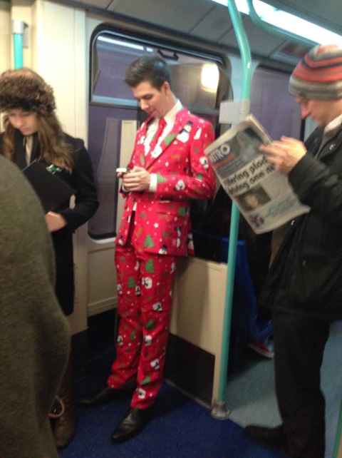 Christmas Suit on the Subway - Ugly Christmas Sweater Meets High Fashion Fail