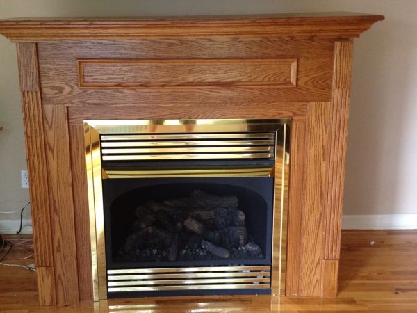 Vail 32 vent-free gas fireplace for sale. Dark oak cabinet with brass hood, louvers & frame. $1000 OBO
