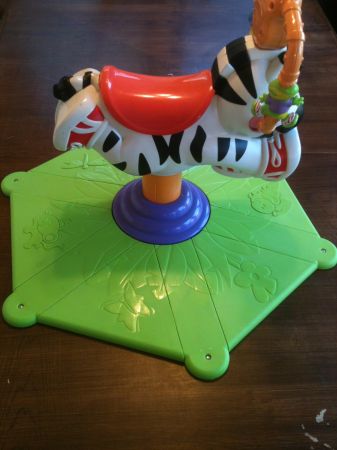 It is Ideal for ages 12 to 36 months this lively zebra enhances motor skills as the child learns coordination, balance, and how to climb on and off. Sure to become every youngster's favorite toy, five uplifting songs play as the child bounces and turns 360 degrees. Fun sounds reward movement and strengthen auditory skills. The Bounce and Spin also has an activity handlebar with a rolling ball to encourage eye-hand coordination.