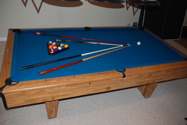 mes with cue rack, 2 sets of balls, 4 sticks, table brush, chalk, net, 4 ping pong paddles