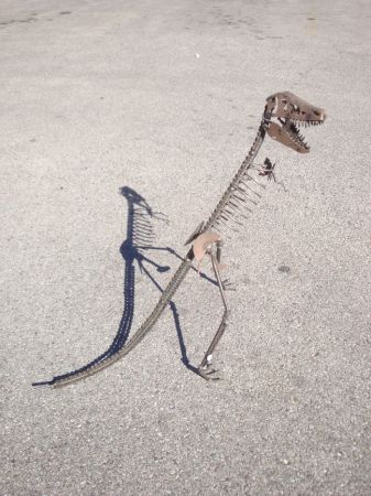 Add this great piece of Folk Art to your collection! This Dr Evermor?? T-Rex sculpture made from found pieces of metal including a bike chain, nails, gear plates, rebar and other found objects. Great for someone interested in folk art, tyrannosaurus rex, or dinosaurs. Lots of details, solidly built and it's kinetic - his head swivels! Approximately 28" high. $250 obo