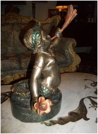 Beautiful bronze/brass cherub mermaid spitter fountain featuring beautiful colors. The mermaid weighs approx. 22lbs and measures approx. 22" x 16". The water flows from the flower in the mouth. Asking $750 if interested call 219-877-9202