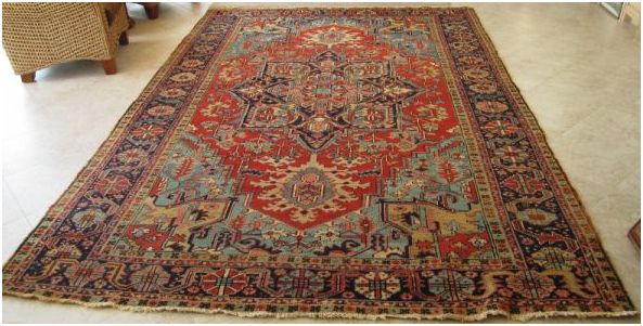 Elegant is the word for this beautiful 100 year old Heriz Persian carpet, look at the pictures. A carpet made in the early 20th century in the Heris East Azerbaijan in the northeast of Iran. There is much more information on these highly prized carpets on the Internet. It can easily be read by putting in Heriz carpets. This perticular carpet is in excellent condition for its age. There are no stains just some wear on the fringe as can be see. The carpet appears clean it has not been used for over 50 years its just been in storage. The carpet measures 8 feet 8 inches by 12 feet 8 inches, it lays nice and flat. It has a really nice feel to it, thick 100% wool with cotton backing. If you are a conaceuer of fine antique carpets this will have a prominent place in your collection. You are welcome to call and come and look. Give us a call at six one nine-423- nine nine five eight we will be happy to scedule an appointment at your convience to view this beautiful carpet.
