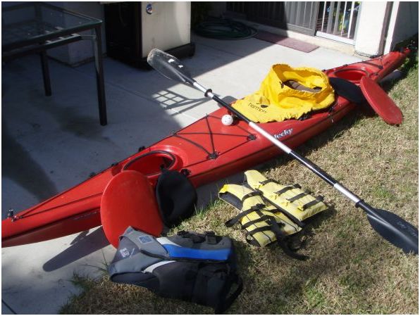 The kayak I have left is a red 15' Necky Tikani sit-inside Kayak left, which is a nice model that is quite expensive new. The cabin on this one is for a medium sized person, I'd suggest under 6' and the length to the rudder peddles can be adjusted for shorter persons as well, although at 6' and 180 pounds, I was able to paddle this kayak. A couple of the rubber tie-down straps to secure gear, etc, are broken, but the kayak is good mechanical condition overall. I initially thought (and posted previously) the cords for the rudder were broken, but they are not...just a couple tie down cables that do not affect use or the rudder.