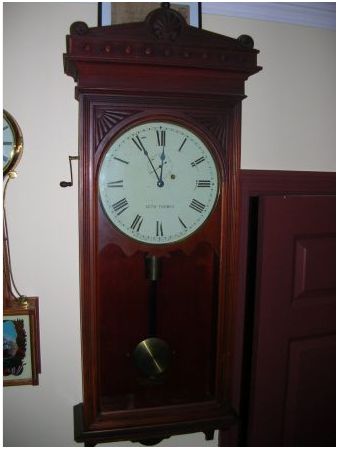 Exquisite and hard to find, I have on consignment a large walnut (or cherry) Seth Thomas model 30 weight-driven wall regulator. The clock is completely untouched; the finish is 100% original and untouched as are the dial, glass, locks, and all mechanical parts. The clock case measures 48 inches at its tallest and 18 inches at its widest. This is a seven day time only movement from circa 1908. There is also a presentation plaque at the base showing it was presented to the Brunswick Club in Liverpool, England, back in 1908. Accompanying it is a framed letter on USO stationary discussing how to wind and set it (WWII era written with fountain pen).