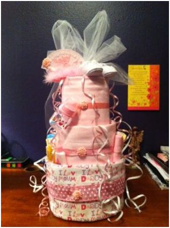 GEORGEOUS PINK THREE TIER BABY SHOWER DIAPER CAKE INCLUDES 50 NEWBORN DIAPERS. THREE FLANNEL BLANKETS WITH JOHNSON AND JOHNSON PRODUCTS A BABY BOTTLE AND BABY WASH CLOTHES SOME BABY SHOES ALSO. THE MOTHER TO BE WILL LOVE IT AND EVERYONE WILL NOT STOP TALKING ABOUT IT AT THE BABY SHOWER.....