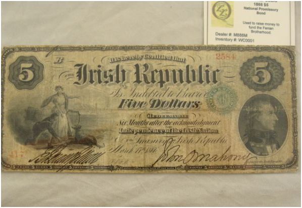 For sale is a Irish Republic 1866 $5 National Promissory Bond. Used to raise money to fund the Fenian Brotherhood. This items has not been professionally graded but I guarantee authenticity or your money back! Price is $150.