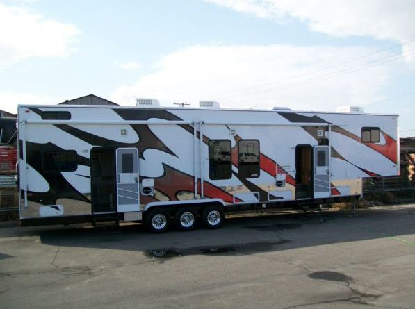 This trailer has it all!!! Generator on board,30 gallon fueling station, 3 a/c units,bay window package,huge fridge with additional fridge in wet bar area, 3 flat panel televisions
