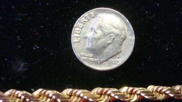 Solid 14K Yellow Gold Diamond Cut Rope necklace. 21 inches long. Approx 4mm thick. Weighs 35.1 grams and has very sturdy barrel lock with safety catch. I have acid tested and it is 14K, no problem. NOT PLATED, SOLID GOLD. You won't come near this price with a retail jewelry store!