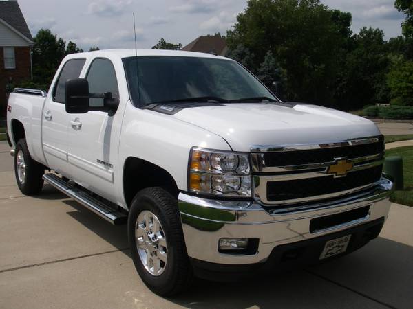 2013 Chevrolet 3/4 ton crew cab 4 wheel drive LTZ white, tan leather, heated/cooled seats, navigation, 18 in alum wheels, HD trailering, front/side airbags,rear camera, camper mirrors, 6 inch factory oval steps, line-x spray in liner. stainless steel bedrails, 12,000 miles, absolutely perfect condition, no smoke, clean car fax. $49,500.00 OBO will take trades call (314) 401-6669.