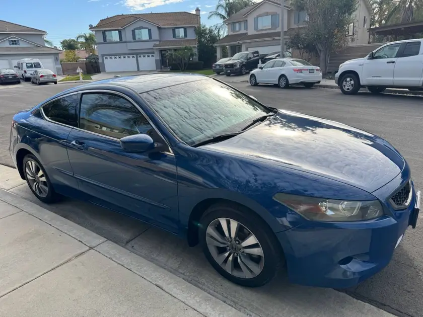 For sale: 2008 Honda Accord EX-L Coupe in excellent running condition. This safe and reliable vehicle has 120,000 miles and is perfect for commuting or daily use. It comfortably seats five passengers and features a sleek blue exterior in outstanding condition with a beige leather interior that is exceptionally clean and odor-free.
