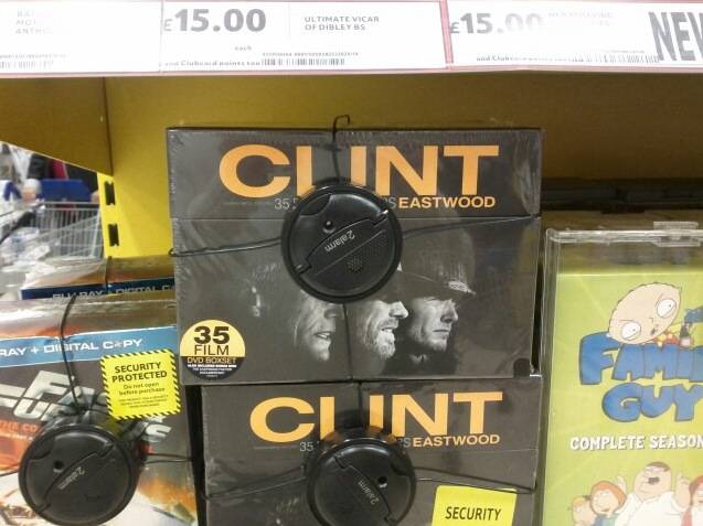 A bad placement of an anti-theft alarm for Clint Eastwood DVD's. Looks like Cunt Eastwood might be a porn movie. Box Fail.