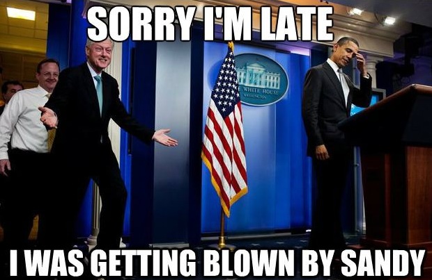 Sorry I'm late. I was getting blown by sandy. Too soon for hurricane sandy jokes?