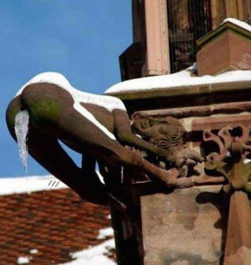 This building statue is as cold as ice. I think it needs to get more fiber in the diet. It looks like diarrhea in the winter.
