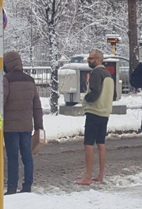 This guy needs to have his mommy dress him in the morning. Looks like he forgot to put on some boots. That snow looks cold!